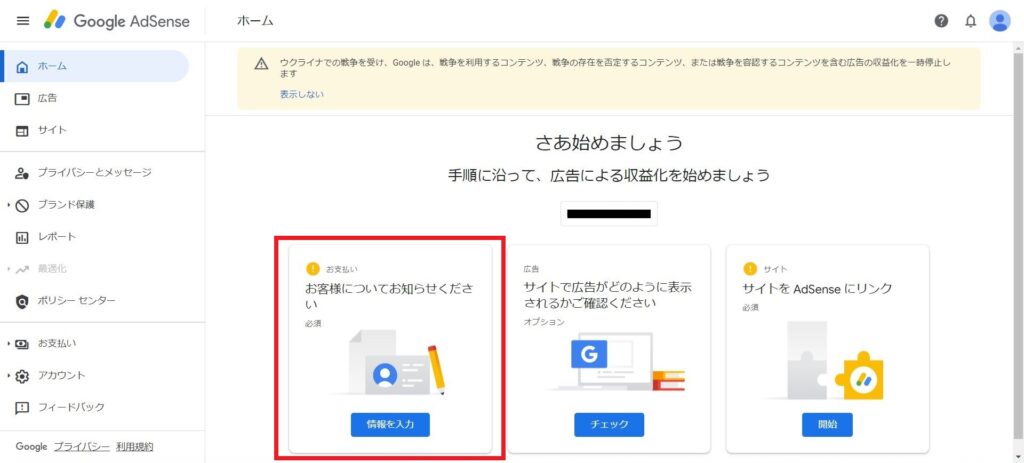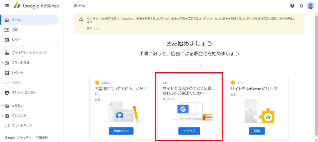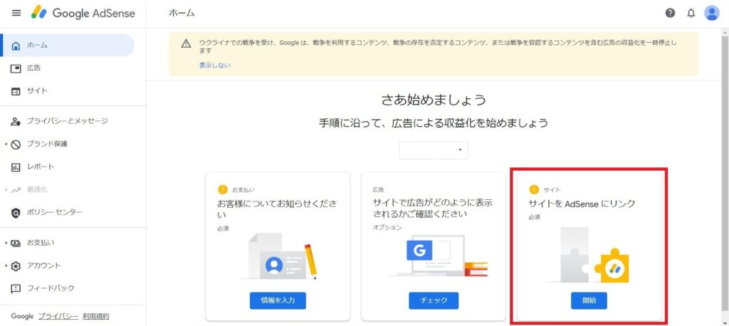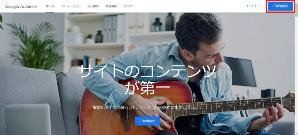 Google AdSenseへアクセスし、「ご利用開始」を押下