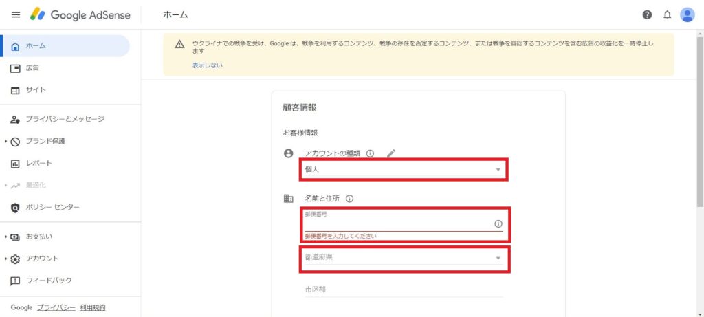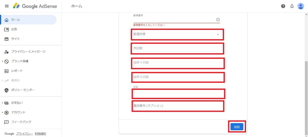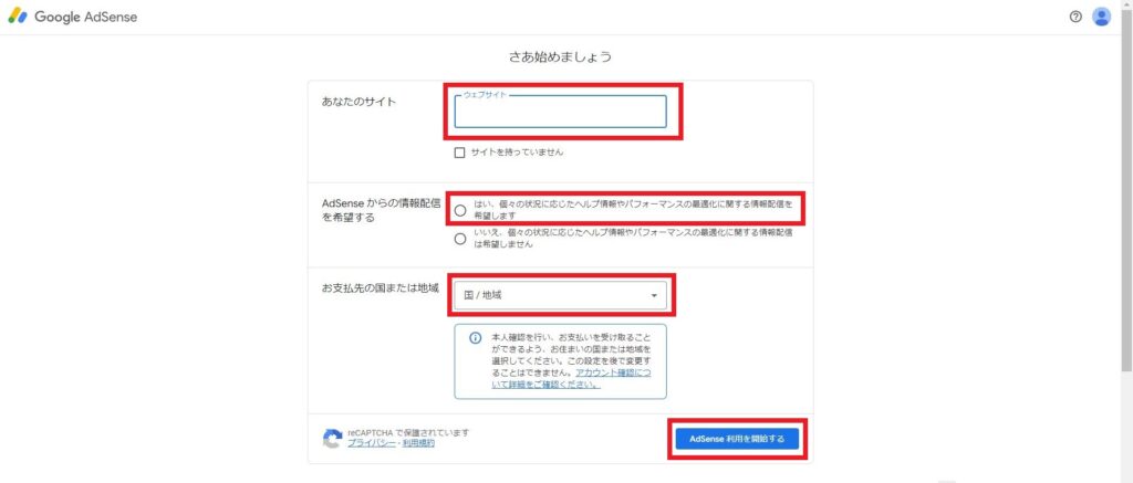 各項目を入力し、「AdSense利用を開始する」を押下