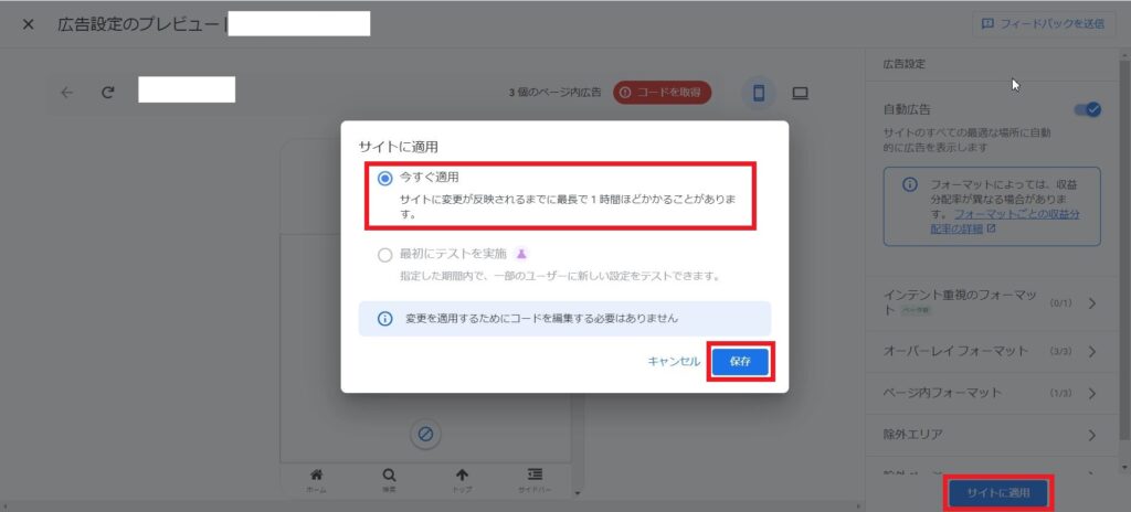 広告コードにコードを貼り付けたら、「変更をまとめて保存」を押下