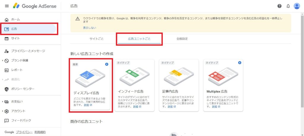 メニューから「広告」「広告ユニットごと」「ディスプレイ広告」と選択し