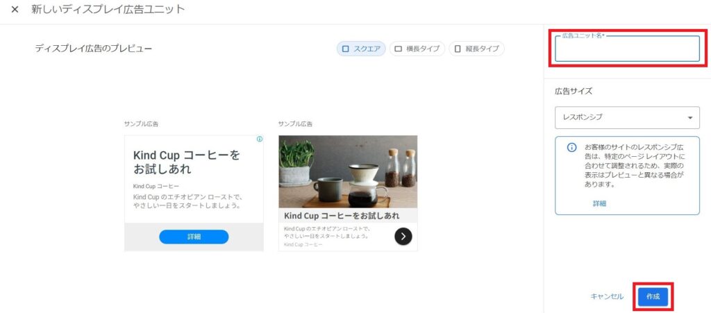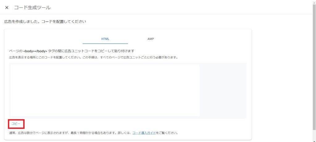 広告ユニットを作成後に、「コピー」押下