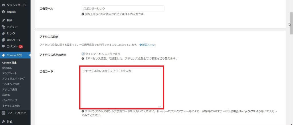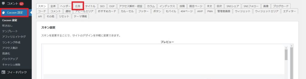 管理画面で「Cocoon設定」「広告」と押下し