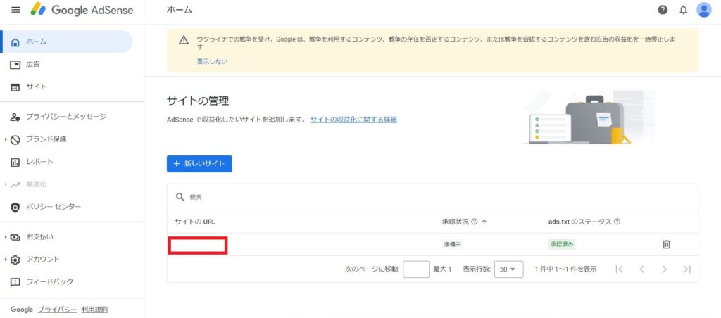 Google AdSenseでサイトの所有権を確認後、「審査をリクエスト」を押下